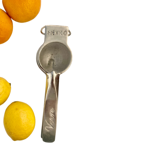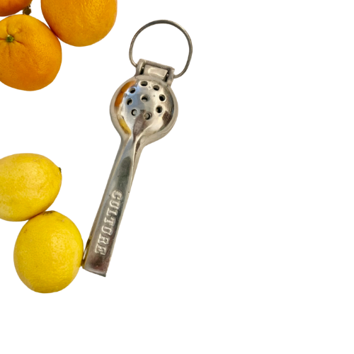 Stainless steel lemon squeezer in the shape of a fish with etched scale details