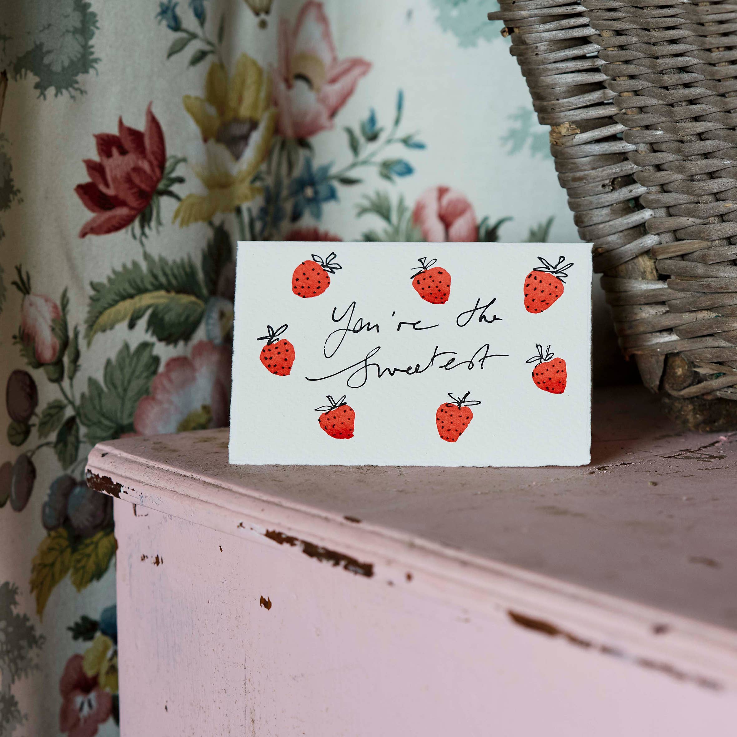 Introducing our sweet strawberries, fun and versatile, created from an original dip pen drawing, letterpress printed in black ink and individually hand-painted with to make a delicious design that will work for thank yous and notes, as well as for loved ones.