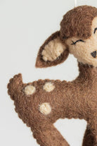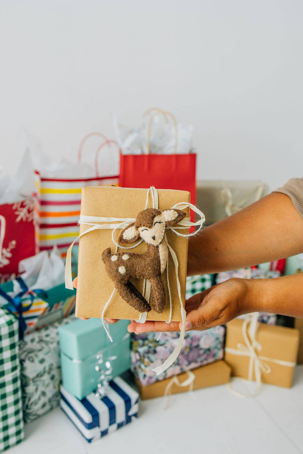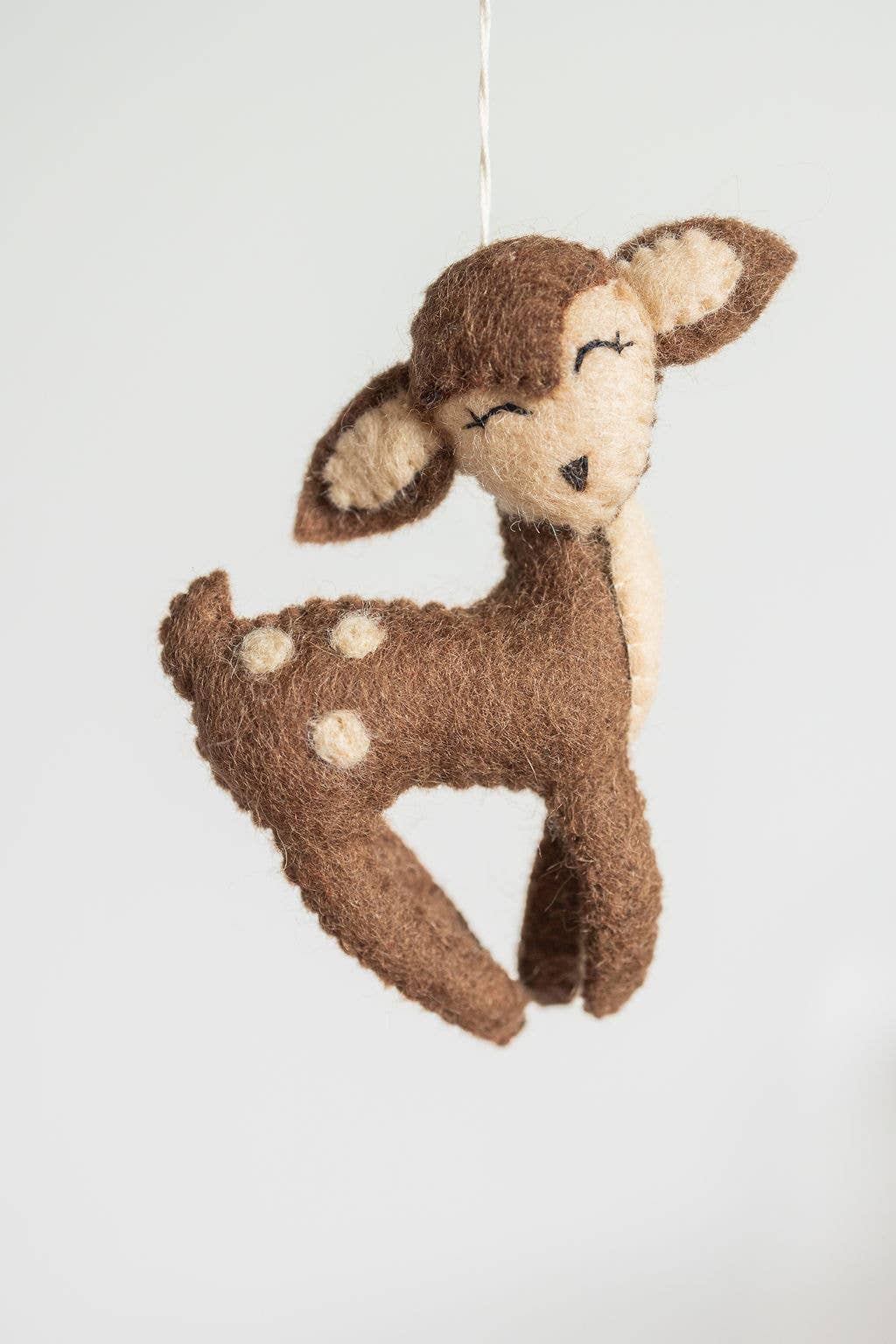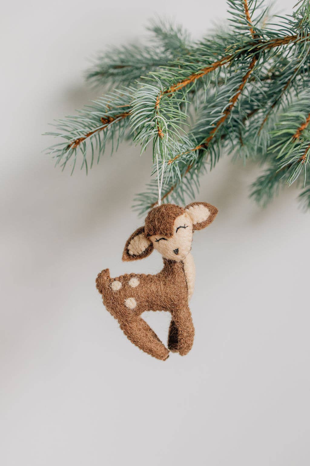 - Handmade from wool felt and crafted with Azo-free dyes for a sustainable and eco-friendly ornament - Our deer ornament is 4 inches tall (height), 3.5 inches across (length), and 0.5 inch thick (width) - Each ornament comes ready to hang with a sturdy cotton loop for effortless display - Due to the handmade nature of this ornament, colors and sizes may vary slightly In addition to our fair trade commitment, we support our artisans with free health camps, meal assistance, and legal counseling, promoting their well-being and empowerment. In partnership with farms in Coorg, India, we plant a tree for every ornament sold, helping to offset our carbon footprint and create a greener planet. Woodland animal ornament. Forest themed decoration. Nature inspired holiday decor. Forest creature ornament. Woodland Decor. Fair Trade ornament. Kid's Ornament. Children's Ornament. Kid proof ornament. Home Decor. Animal Ornament. Forest Animal. Fox holiday decor. Rustic animal.