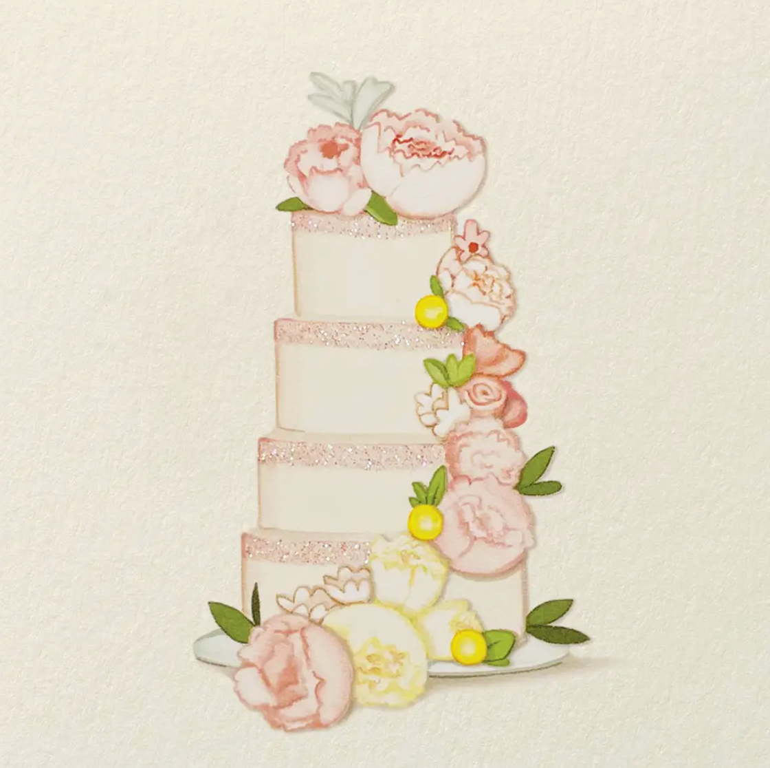 Our Wedding Cake gift enclosure is printed and hand-glittered in Memphis, TN. Hand crafted artwork, full color ink printed on natural white paper, hand-glittered, and paired with a vellum envelope. Book-folded enclosure card, blank on the inside. Paper color | natural white. Envelope color | vellum. Print process | full color. Embellishment | hand-glittered. Dimensions | 3 x 3 inches.